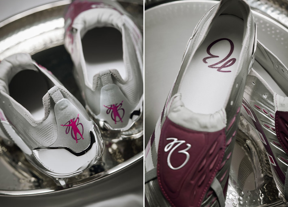 Dấu ấn của Jude Bellingham còn được tìm thấy ở trên lót giày và mặt dưới lưỡi gà, cũng như được in dập nổi trên gót giày, nơi logo 'JB' được hoàn thiện bằng hình ảnh pha ăn mừng quen thuộc của cậu. Các chi tiết màu đỏ tía tinh tế chạy dọc theo mặt trong của đôi giày, đồng thời làm nổi bật các vân cao su tiên tiến (được thiết kế để tối ưu hóa khả năng chạm và kiểm soát bóng). Quả thực, sự kết hợp giữa đỏ tía và bạc đã tạo nên một vẻ đẹp hài hòa và đẳng cấp cho đôi giày đặc biệt này.