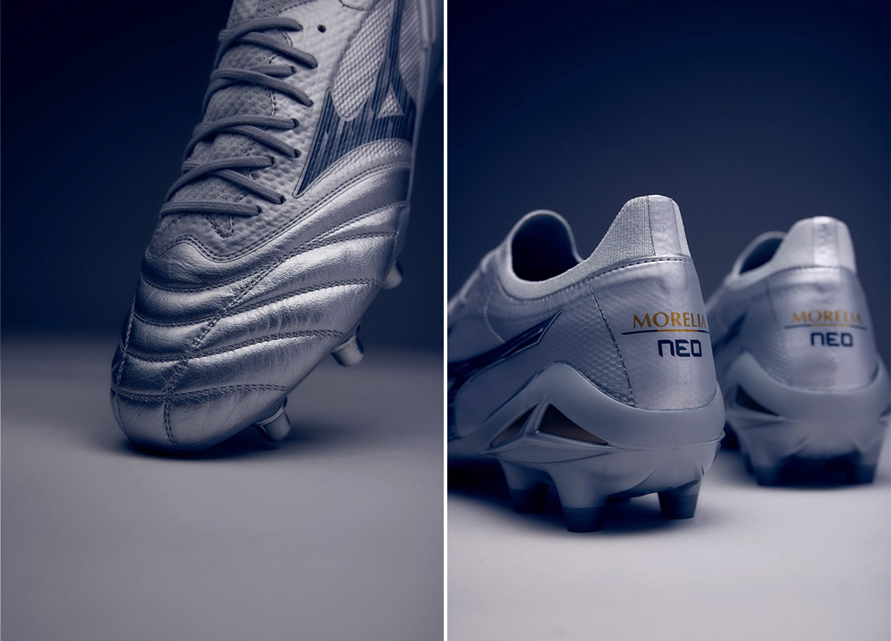 2. Mẫu giày đá bóng Mizuno Morelia Neo IV “Platinum Silver Pack” - Galaxy Silver/Gold/Cool Gray