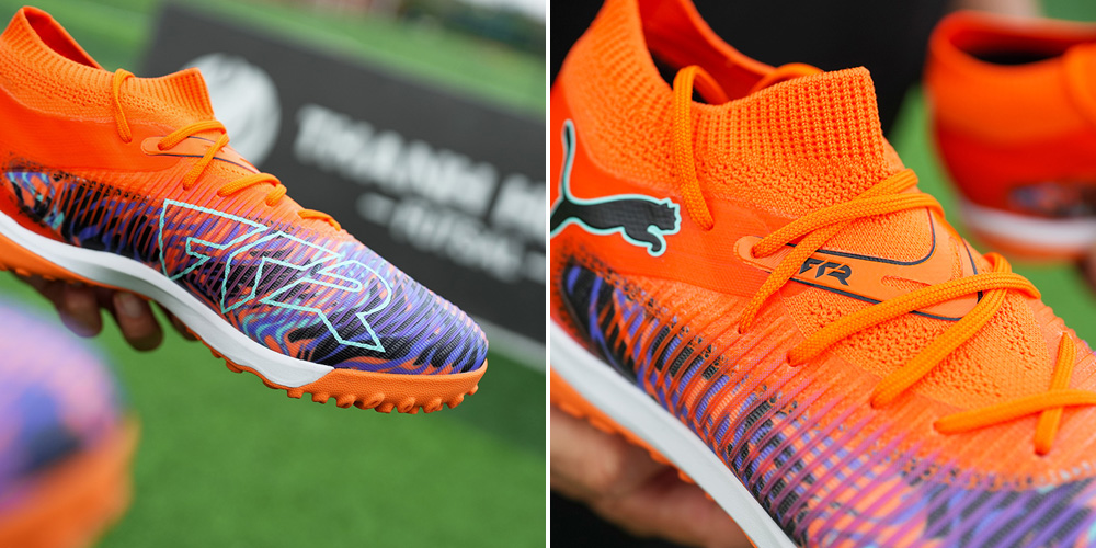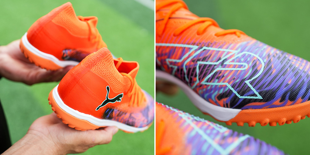 Điểm đặc biệt của mẫu giày này là hiệu ứng chuyển màu tím độc đáo trên upper của Future 8, nổi bật trên nền cam rực rỡ của thân và cổ giày dệt. Các chi tiết màu ngọc lam trên dòng chữ "FUTURE" ở upper và cổ giày tạo nên một tổng thể bắt mắt và đầy phong cách.