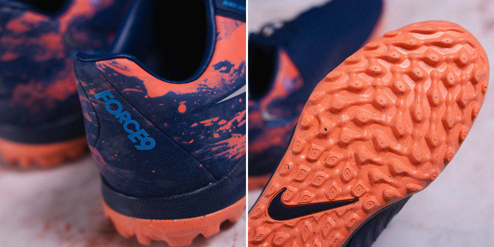 Nike đã khéo léo đưa những hình ảnh thiên nhiên kỳ vĩ như núi lửa phun trào, siêu tân tinh và mưa sao băng vào thiết kế gót giày, trên nền thân giày xanh đậm. Những họa tiết này không chỉ tạo nên điểm nhấn độc đáo, mà còn thể hiện sức mạnh hủy diệt và bản năng săn bàn đáng kinh ngạc của Haaland.