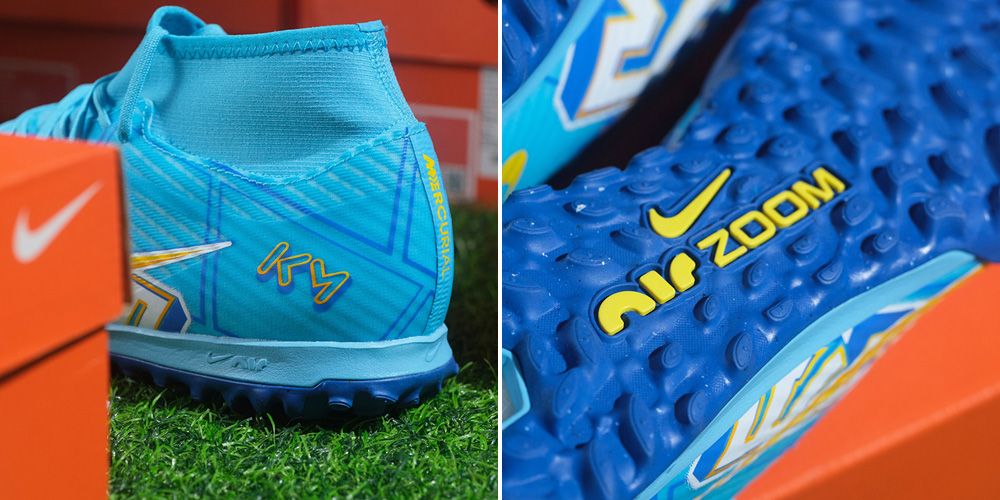 Sự kết hợp màu sắc tinh tế giữa trắng, vàng và xanh lam càng làm tăng thêm sức hút cho đôi giày. Thêm vào đó, tag giày 'KM' ở gót giày là một chi tiết đặc trưng, thể hiện dấu ấn cá nhân của Kylian Mbappé.