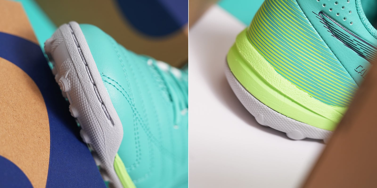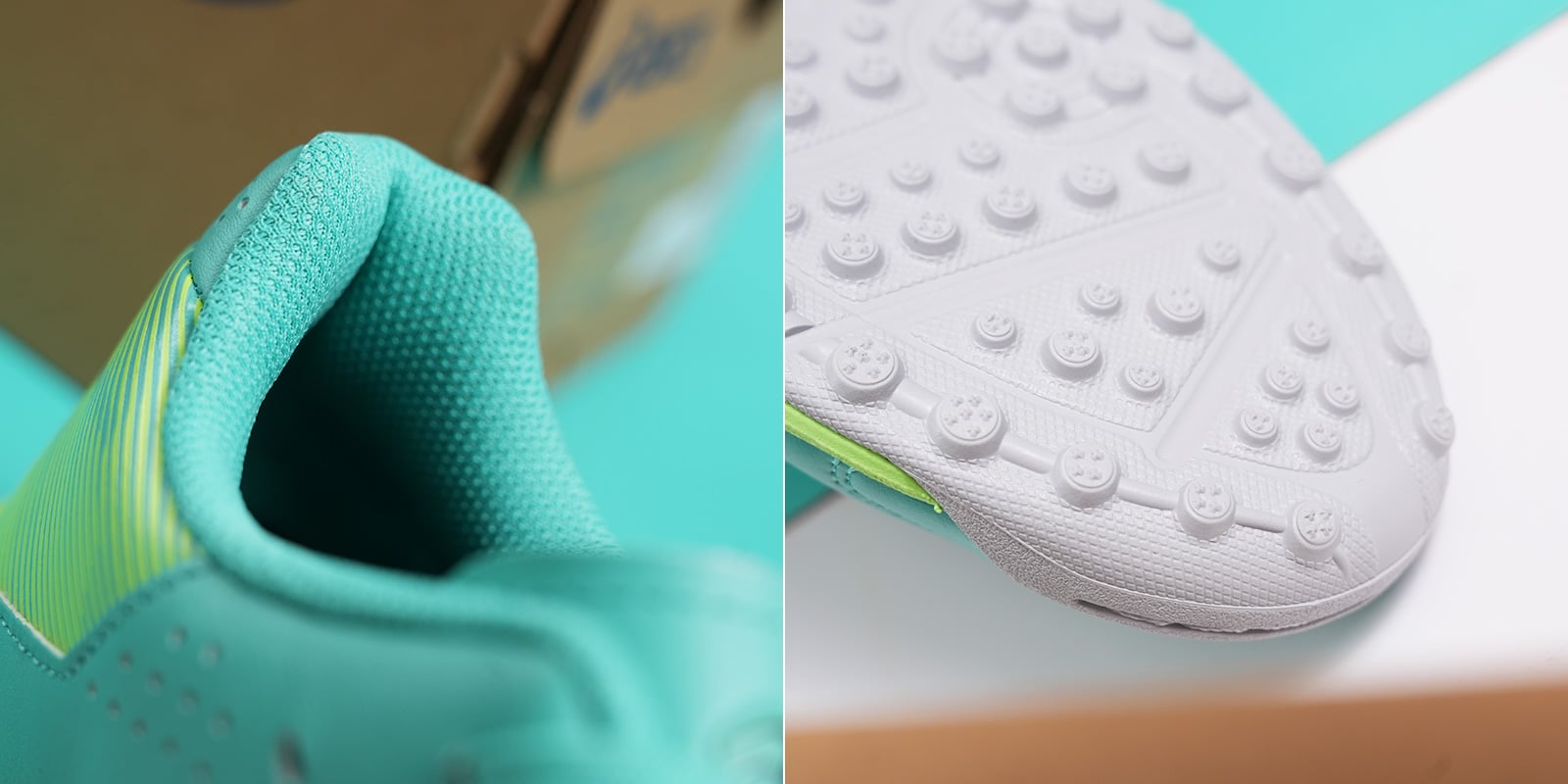 Đế ngoài cao su: Cấu trúc đế cao su chuyên dụng với hệ thống đinh dăm được tính toán kỹ lưỡng, đảm bảo độ bám sân và sự ổn định khi thực hiện các pha xoay người hoặc bứt tốc trên sân cỏ nhân tạo.