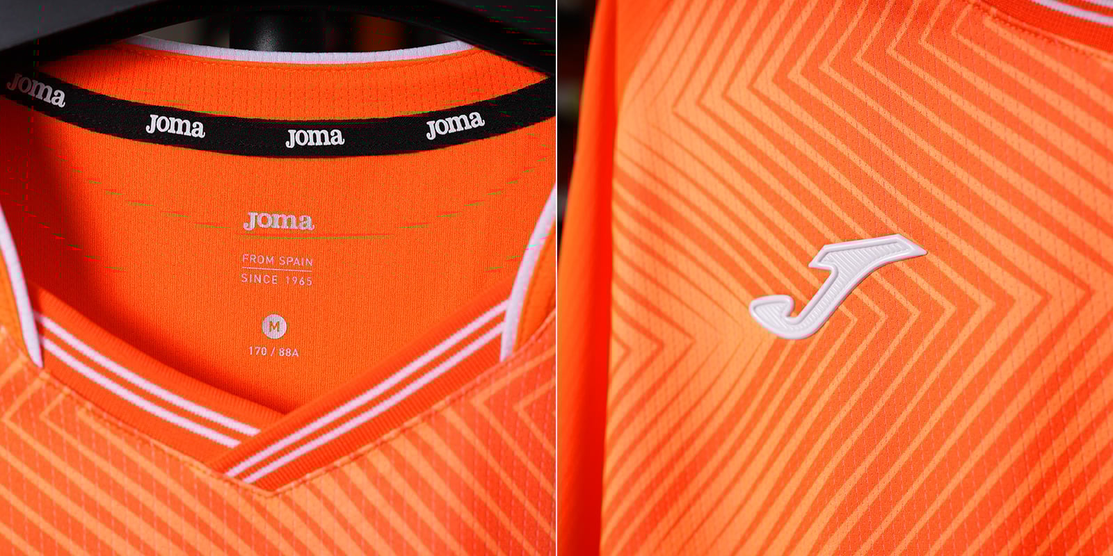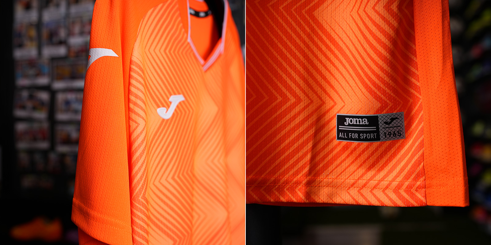 Họa tiết thương hiệu Joma lặp tinh tế trên thân trước, phối lưới eo tương phản tạo hiệu ứng thị giác nhiều tầng, nổi bật trên sân cỏ.