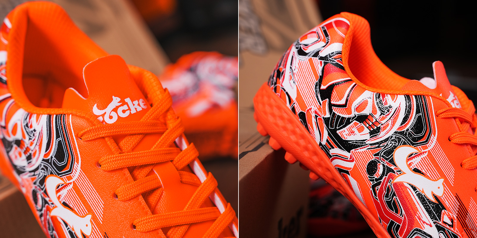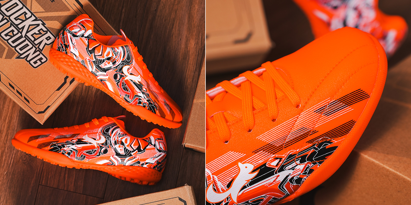 Không chỉ bền, ôm chân tốt, mẫu giày này còn được phối màu cá tính: cam rực cháy – đen mạnh mẽ, thể hiện đúng tinh thần “máu lửa” của các cầu thủ nhí mỗi lần ra sân.