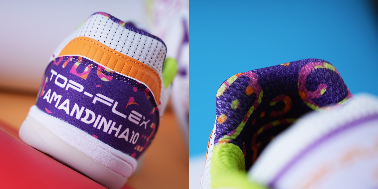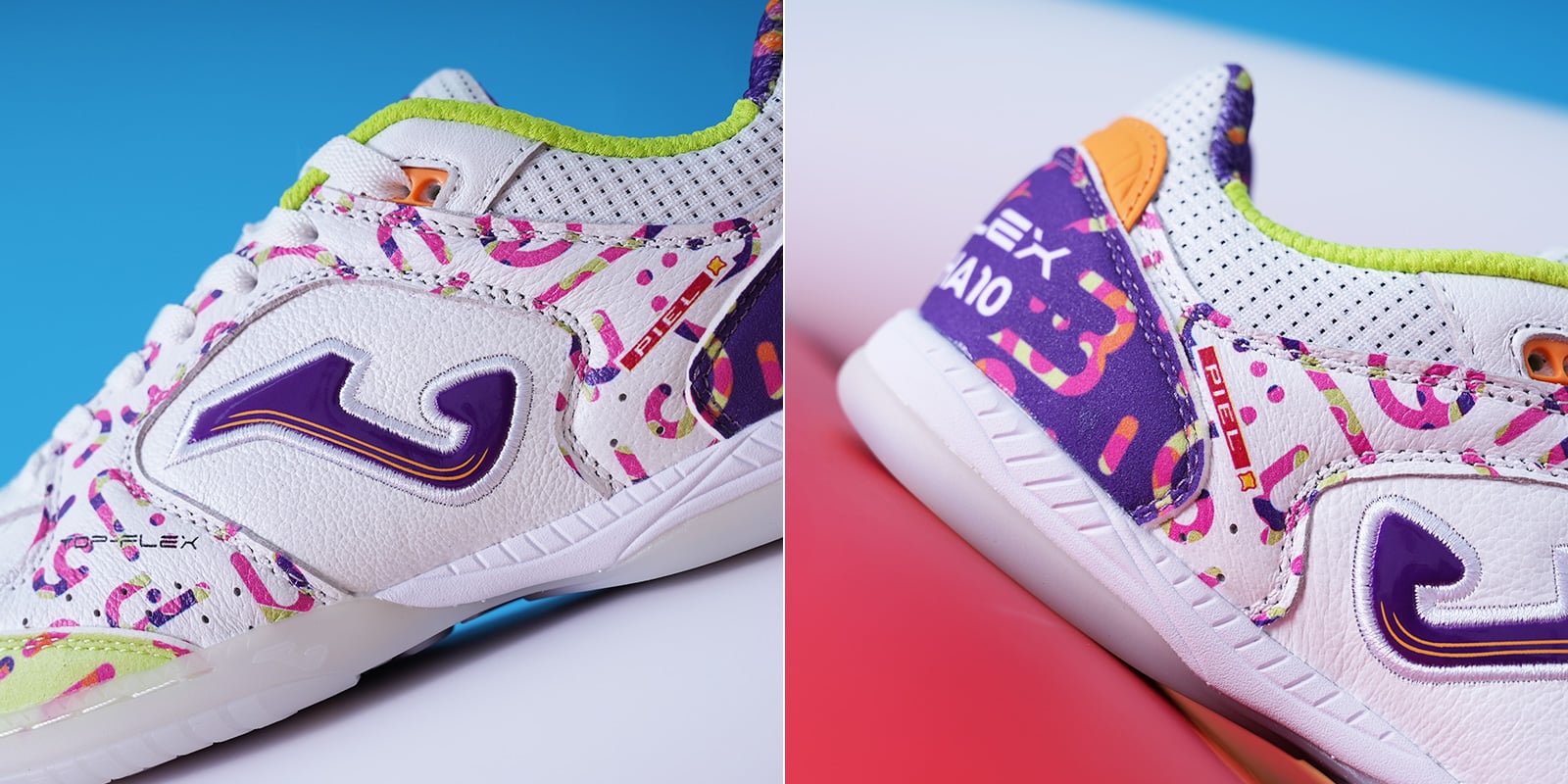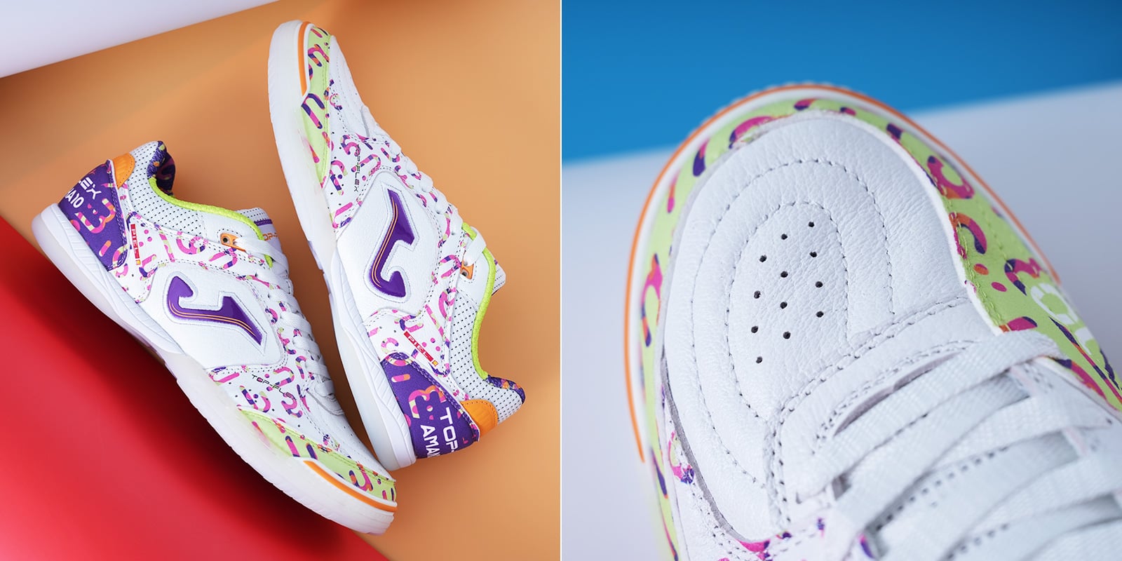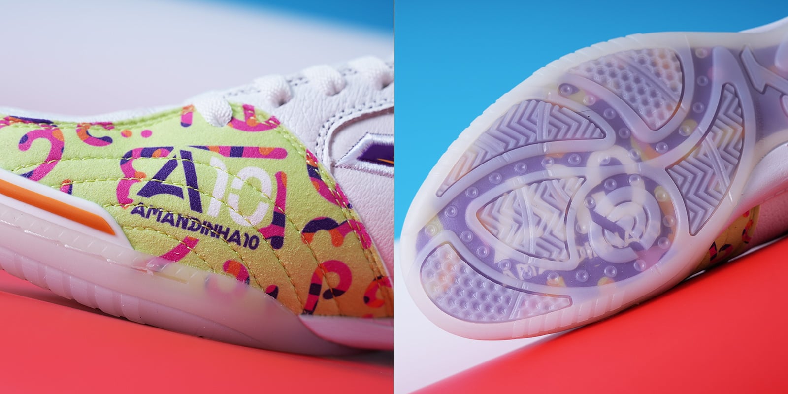 Phiên bản Amandinha gây ấn tượng mạnh với logo Joma và các chi tiết điểm xuyết màu tím nổi bật trên nền da trắng cao cấp. Chữ ký và biểu tượng riêng của "Nữ hoàng Futsal" được in trang trọng, khẳng định giá trị sưu tầm cực cao cho bất kỳ baller nào muốn khác biệt trên sân.