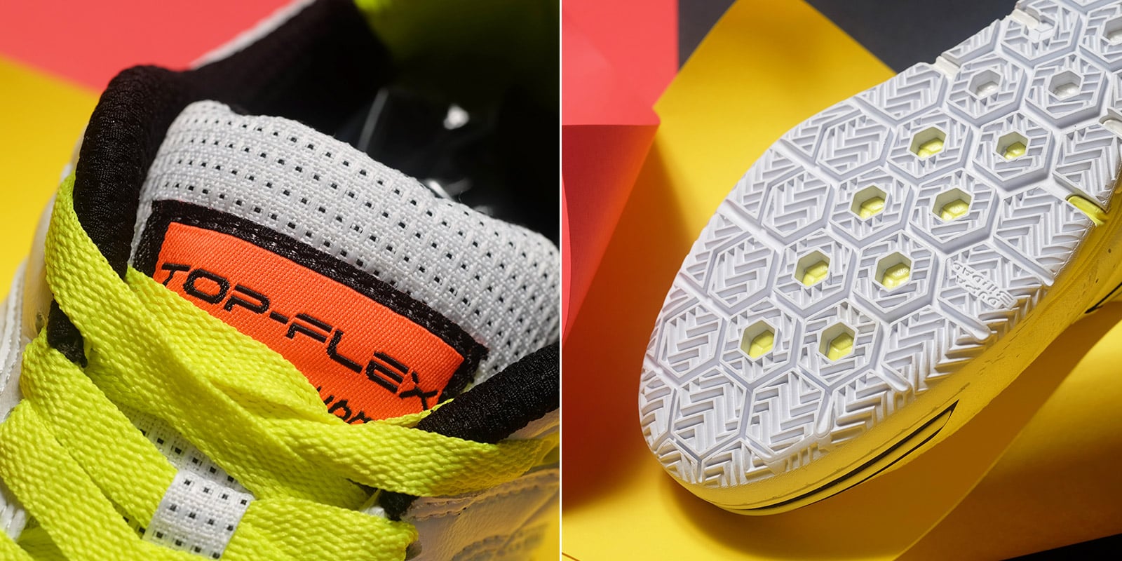 Đế ngoài được làm từ chất liệu cao su cao cấp với khả năng chống mài mòn cao, giúp tạo độ bám sân hoàn hảo cho mặt sân trong nhà. Trên mặt đế, hãng còn áp dụng công nghệ Flexo bao gồm các đường rãnh uốn trải dài phần gót tới mũi chân, hỗ trợ khả năng bám sân và xoay trở tối đa.