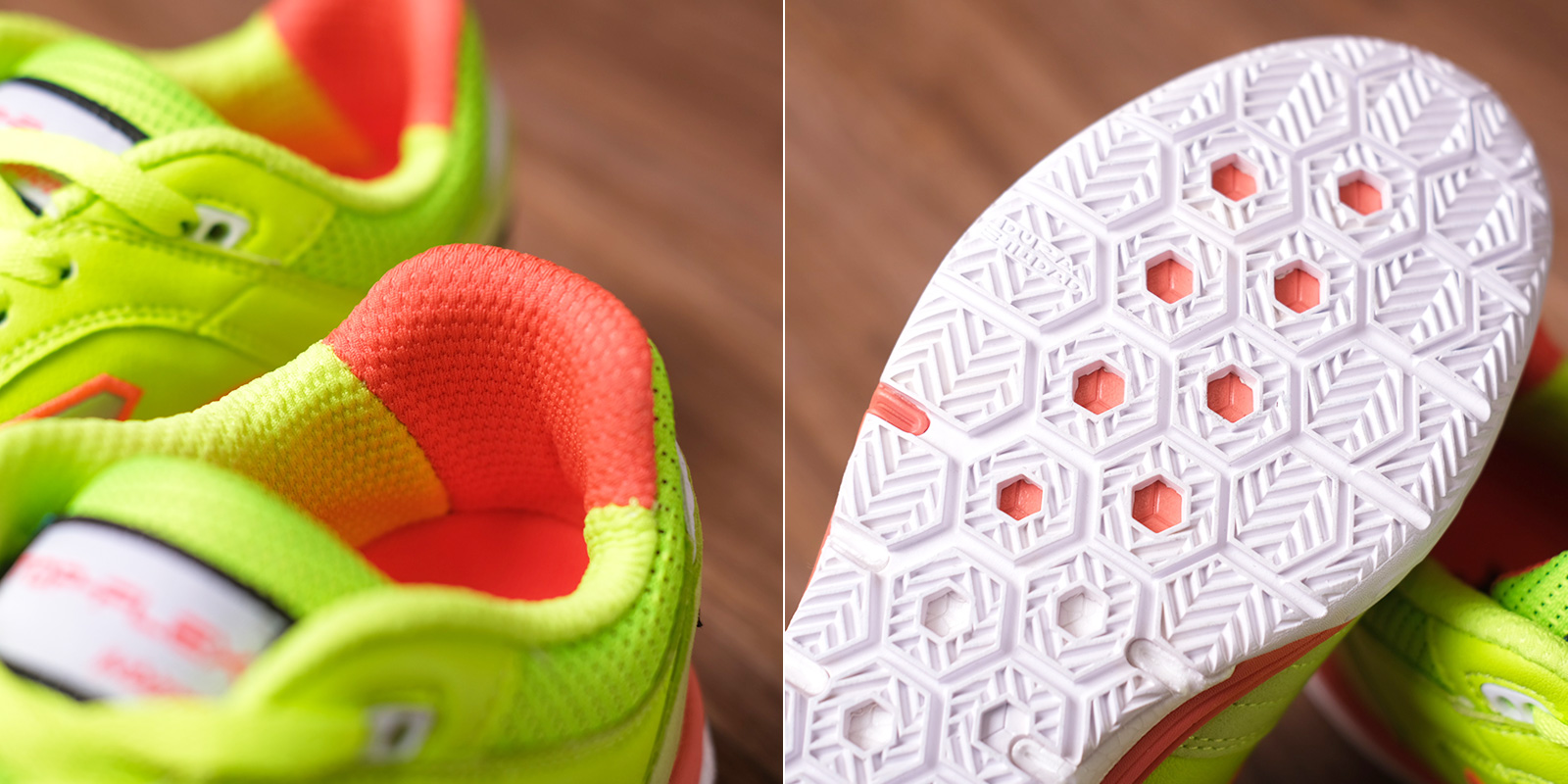 Đế ngoài được làm từ chất liệu cao su cao cấp với khả năng chống mài mòn cao, giúp tạo độ bám sân hoàn hảo cho mặt sân trong nhà. Trên mặt đế, hãng còn áp dụng công nghệ Flexo bao gồm các đường rãnh uốn trải dài phần gót tới mũi chân, hỗ trợ khả năng bám sân và xoay trở tối đa.