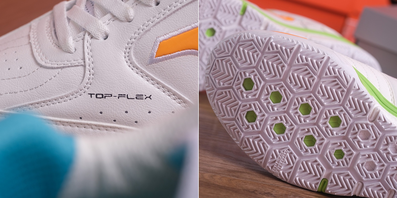 Đế ngoài được làm từ chất liệu cao su cao cấp với khả năng chống mài mòn cao, giúp tạo độ bám sân hoàn hảo cho mặt sân trong nhà. Trên mặt đế, hãng còn áp dụng công nghệ Flexo bao gồm các đường rãnh uốn trải dài phần gót tới mũi chân, hỗ trợ khả năng bám sân và xoay trở tối đa.