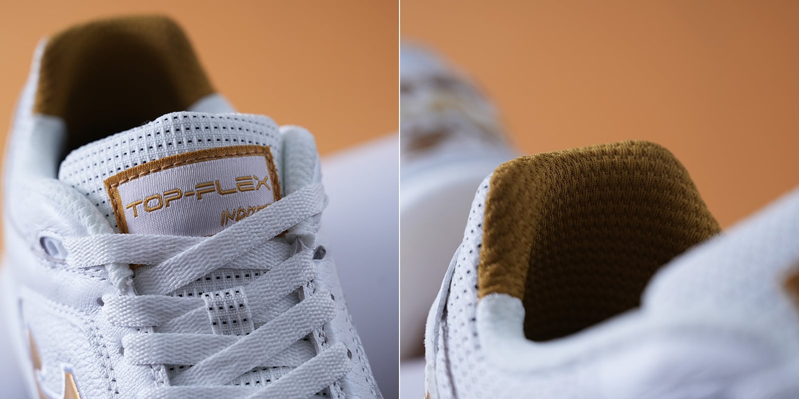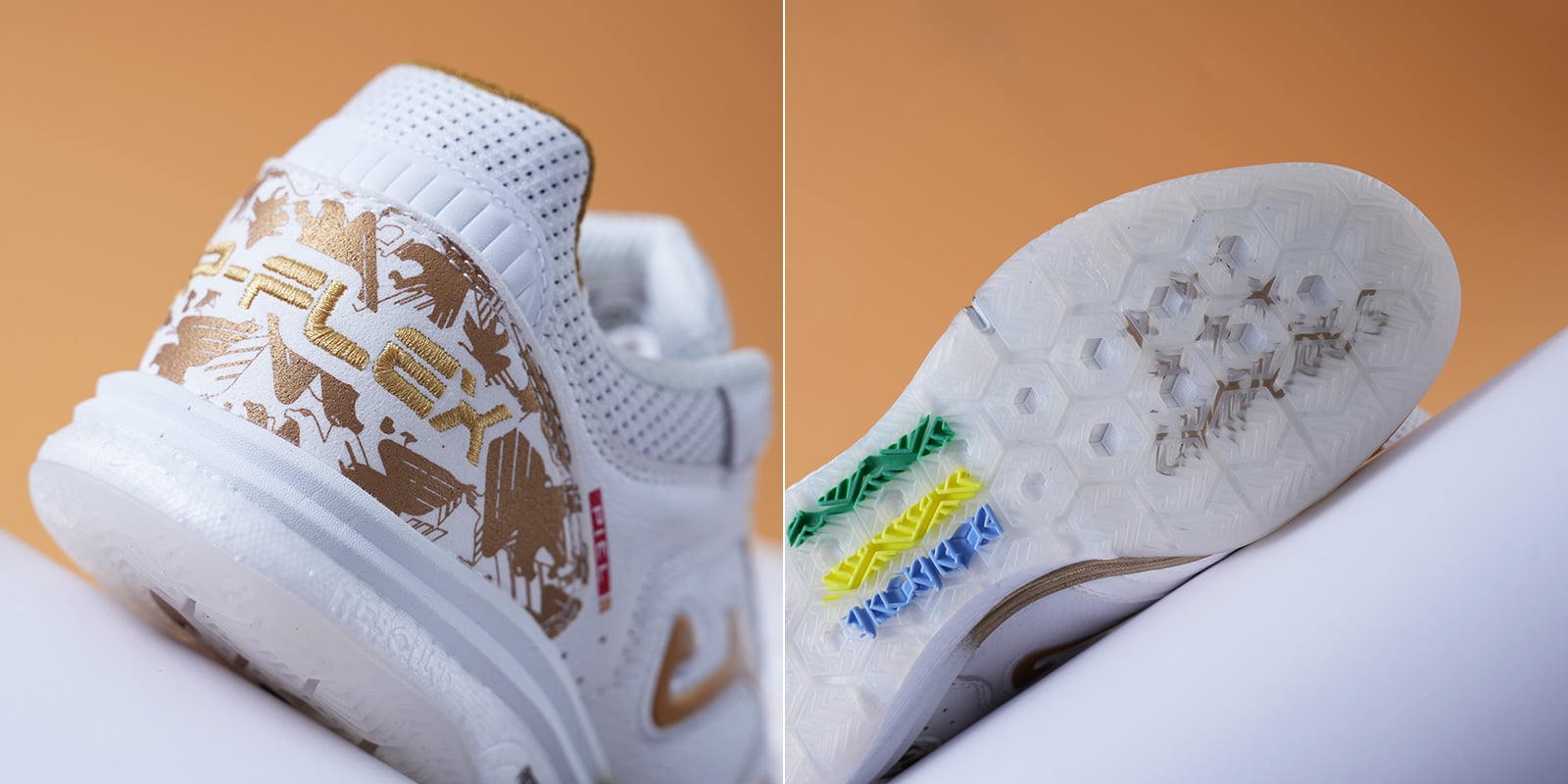 Thiết kế thẩm mỹ cao: Sự kết hợp giữa tông màu Trắng thuần khiết và các chi tiết Vàng Đồng (Gold) sang trọng, kết hợp cùng họa tiết lục giác tạo hiệu ứng 3D chiều sâu, giúp đôi giày trông cực kỳ cơ bắp và hiện đại.