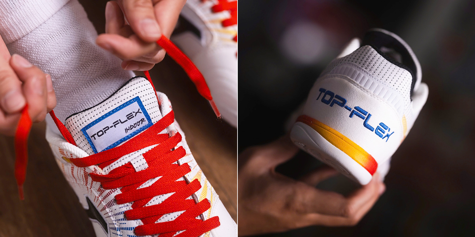 Đế ngoài được làm từ chất liệu cao su cao cấp với khả năng chống mài mòn cao, giúp tạo độ bám sân hoàn hảo cho mặt sân trong nhà. Trên mặt đế, hãng còn áp dụng công nghệ Flexo bao gồm các đường rãnh uốn trải dài phần gót tới mũi chân, hỗ trợ khả năng bám sân và xoay trở tối đa.