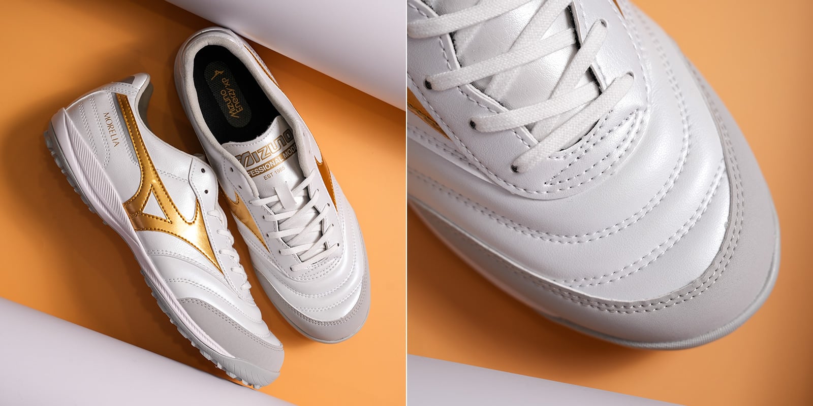 MIZUNO MORELIA SALA PRO TF Q1GB261350 - GIÀY ĐÁ BÓNG SÂN CỎ NHÂN TẠO - PHỐI MÀU SUPER WHITE PEARL/GOLD | BRIGHT GOLD PACK (12/2025)