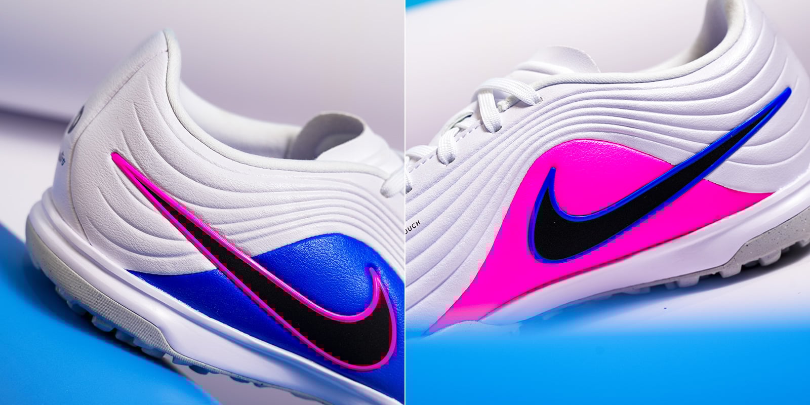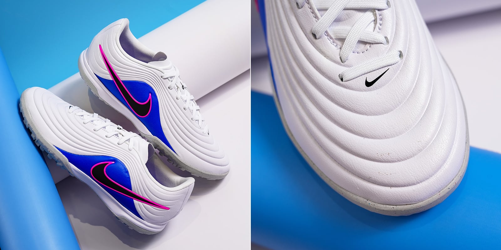Phần upper sử dụng da tổng hợp kiểu “da kỹ thuật” (engineered synthetic leather), ưu tiên cảm giác êm khi chạm bóng và độ ổn định form. Bề mặt upper có các đường dập nổi/gợn sóng giúp tăng cảm giác bóng ở những nhịp chạm nhanh, đồng thời giúp bóng “dính” và đi gọn hơn khi rê, hãm và xoay trở. Điểm hay của kiểu upper này là mềm và dễ break-in, thường không cần “làm mềm” quá lâu như một số dòng upper cứng.