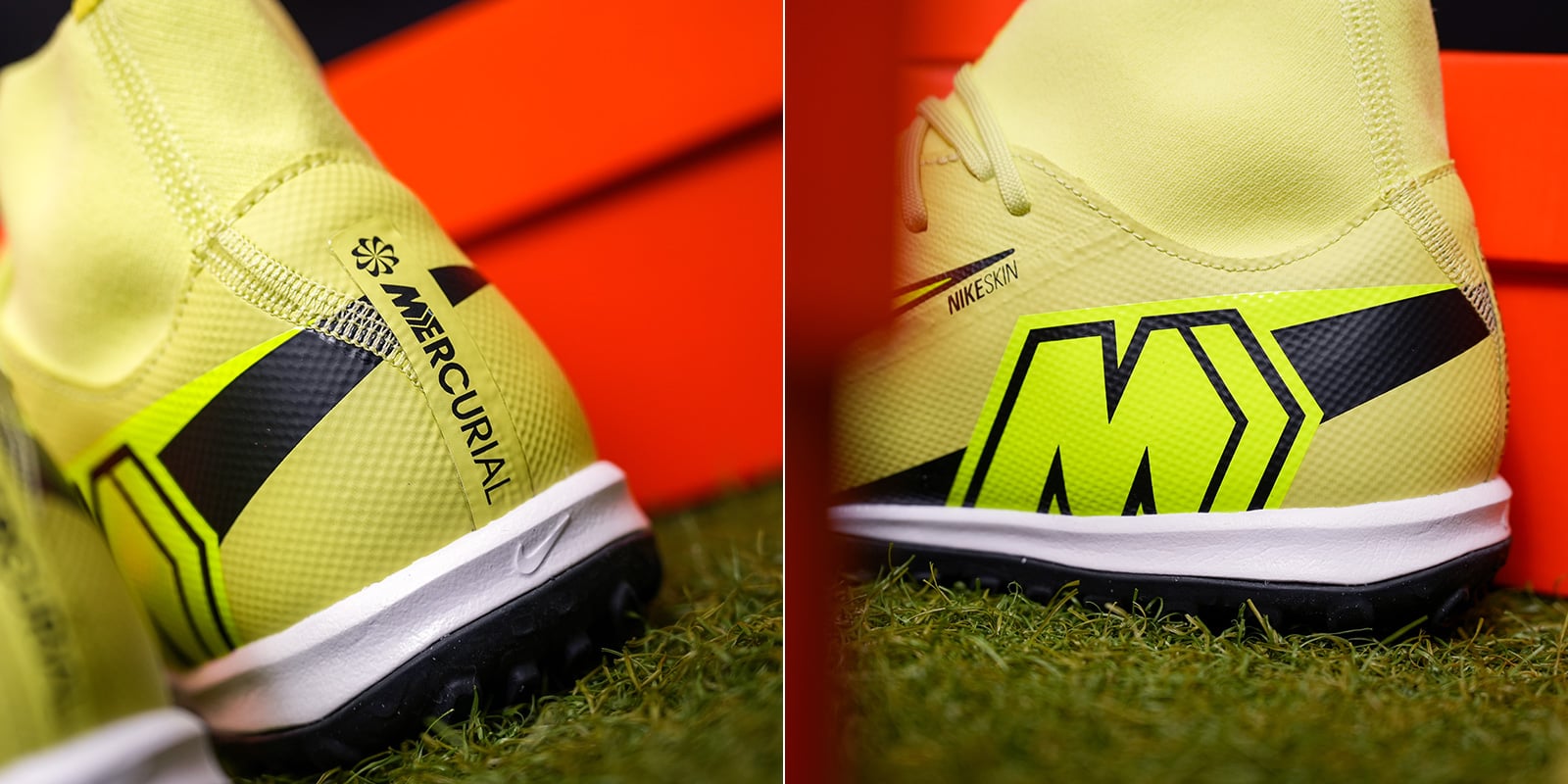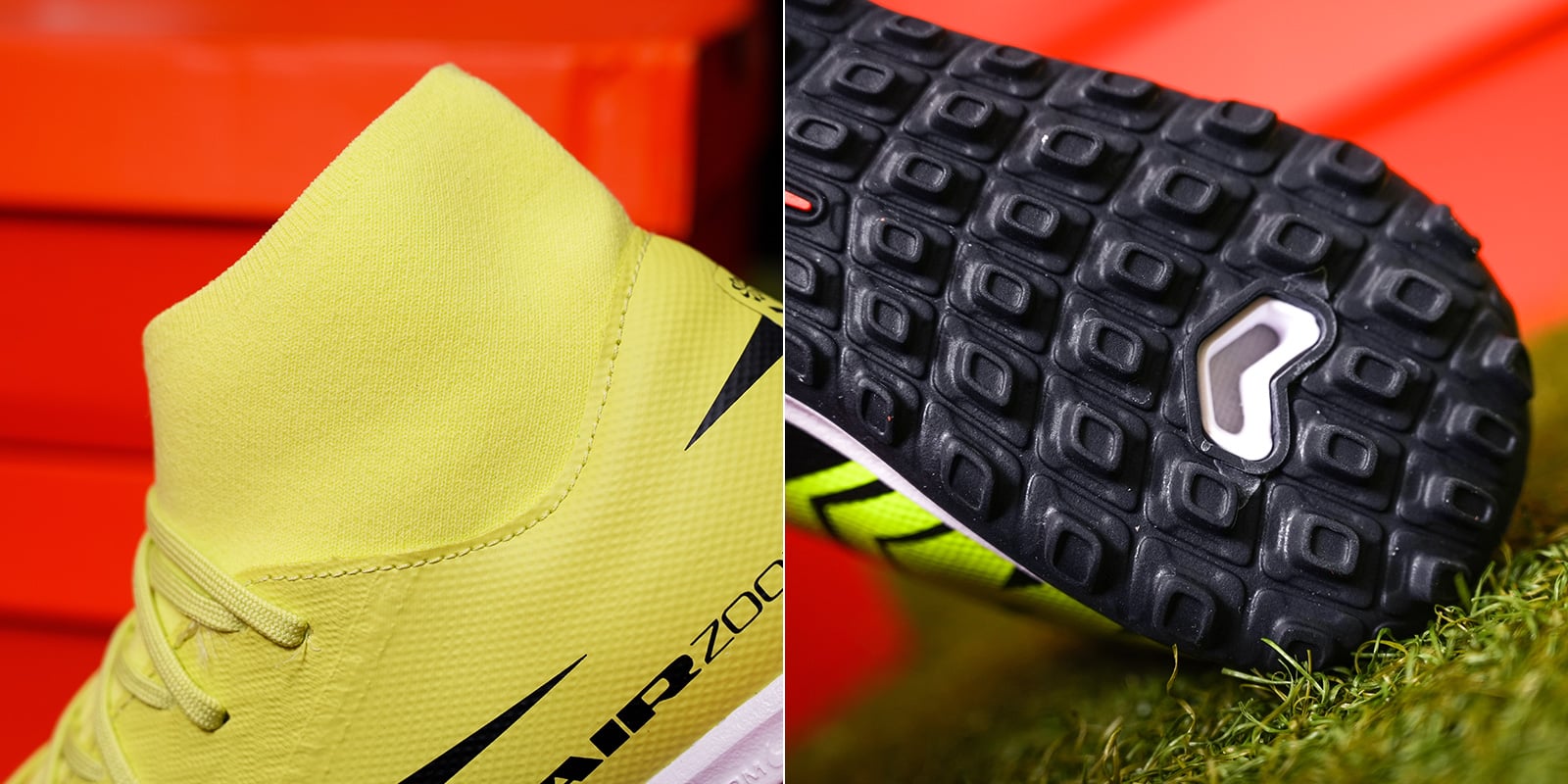 Phiên bản Superfly 10 Academy TF được trang bị đệm Air Zoom ở gót giúp tăng độ đàn hồi và cảm giác “bật” rõ rệt khi di chuyển. Phần upper NikeSkin có các gân nổi chevrons giúp tăng độ bám và cảm giác bóng tự nhiên hơn, hỗ trợ người chơi kiểm soát bóng linh hoạt trong mọi tình huống.