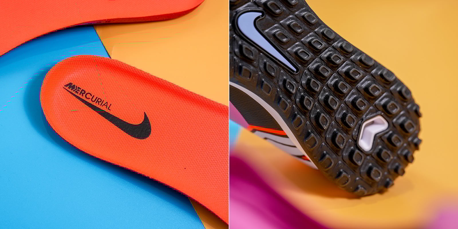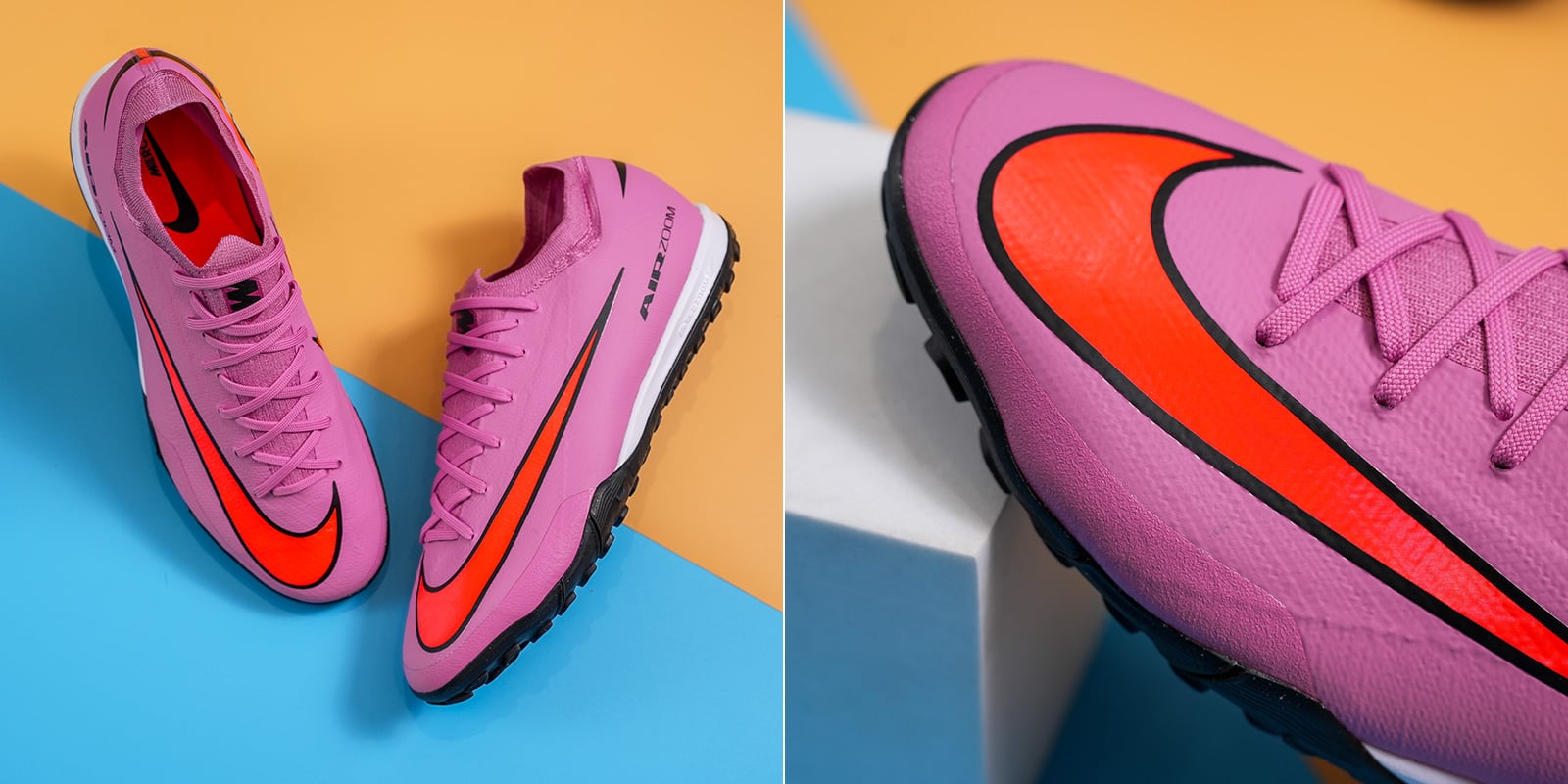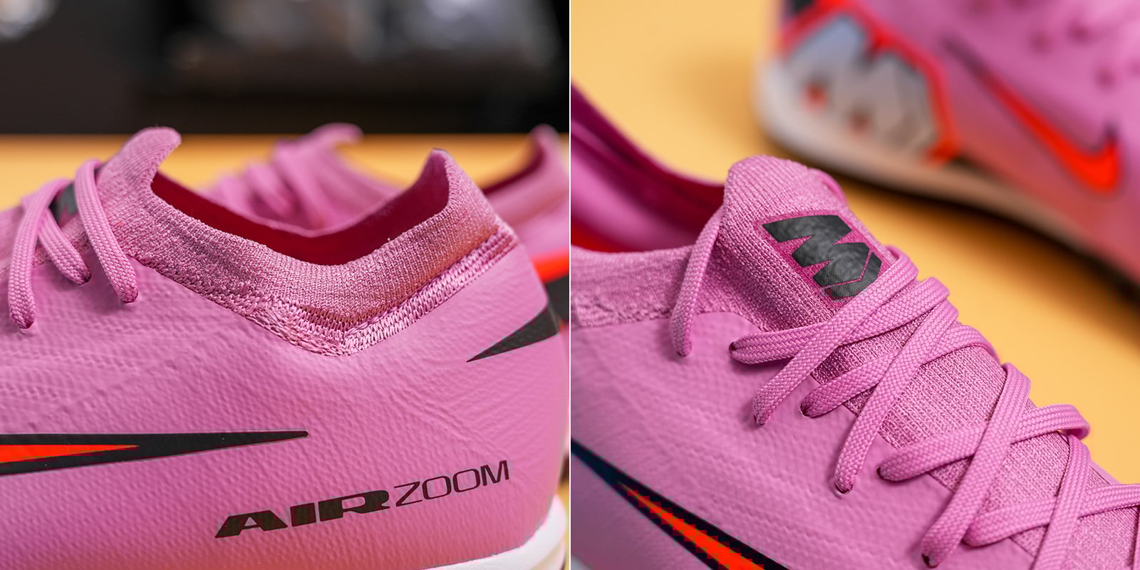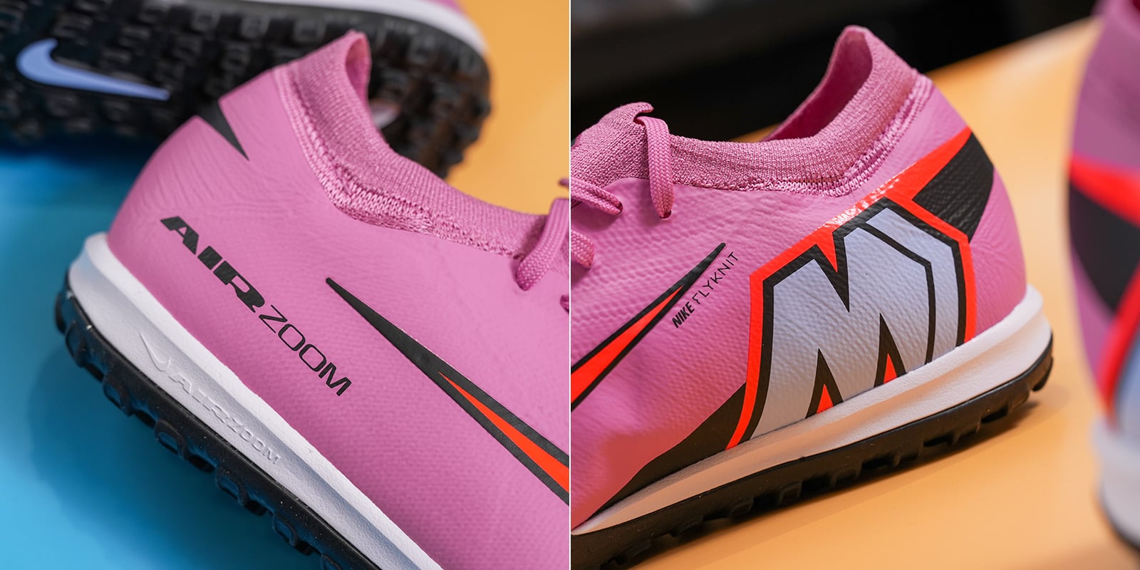 Phần thân giày được làm hoàn toàn từ sợi dệt Flyknit mỏng nhẹ – lần đầu tiên xuất hiện trên dòng Mercurial TF – giúp ôm sát và thích ứng với bàn chân, mang lại cảm giác bóng chính xác và tự nhiên.